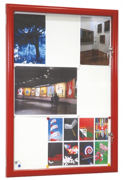 Fond tôle laquée électrozinguée magnétique pour affichage par aimant blanche RAL 9010. Charnières inox de type piano – 1 serrure, 2 serrures à partir du format 12 pages A4. Serrure dans le vitrage. Ouverture « porte levante » sur format 8 pages A4. Ouverture « porte battante » sur les formats 9, 12 et 16 A4.
